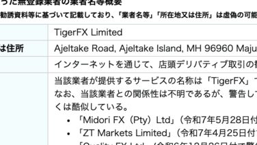 FX 金融庁から警告、TigerFX Limitedの投資には注意 あなたは今、TigerFX Limitedの投資に興味を持ち、本当に稼げるのかを知りたいのではないだろうか?また、TigerFX Limitedがどんな内容なのかを調べようとしているのではないだろうか?答え、結論を言うと、TigerFX L... 2025.11.15 FX金融庁から警告
