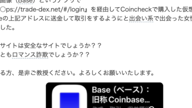 投資 trade-dex.netに注意 気になるネット上の口コミ(ヤフー知恵袋)添付画像(Base)というアプリで『ht○ps://trade-dex.net/#/login』を経由してCoincheckで購入した仮想通貨をBaseの上記アドレスに送金して取引をするようにと出会い... 2025.12.09 投資