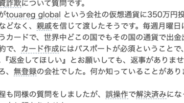 投資 Touareg Groupの「TrustglobeX」、volante cardの口コミ 気になる口コミ(ヤフー知恵袋より)投資詐欺について質問です。母がtouareg global という会社の仮想通貨に350万円投資しました。預かり証や契約書などなく、親戚を信じて渡したそうです。毎週月曜日に利息がつきvolante card... 2026.04.11 投資