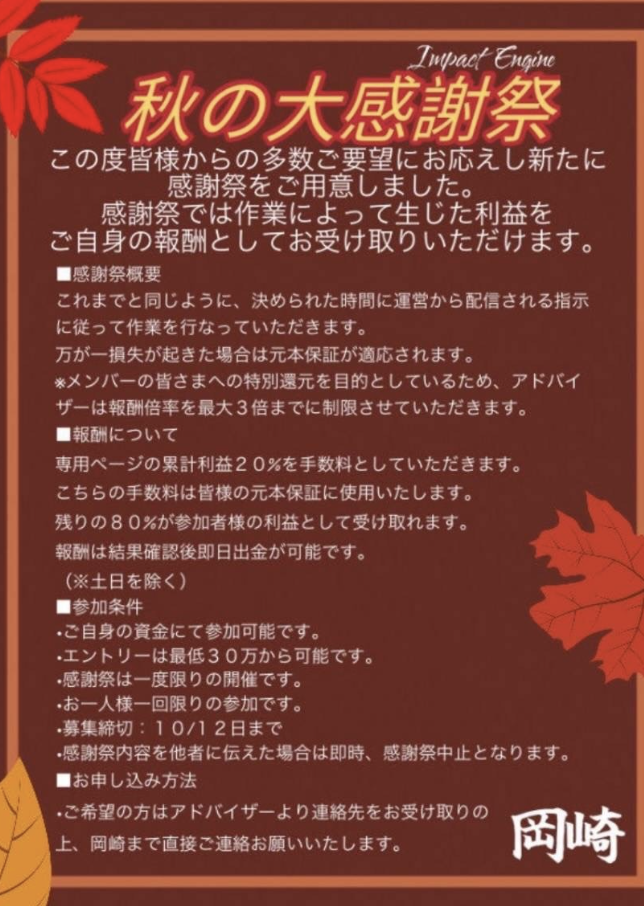 一年前から同じ手口で、SNSでバカを勧誘して振込させては逃げて、IMPACT ENGINEに名前変えて同じことしてる様子がありますねえ。