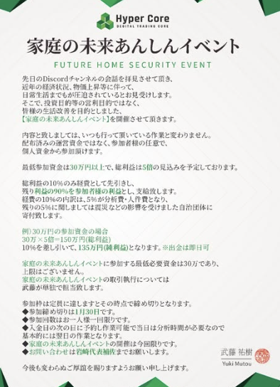 一年前から同じ手口で、Hyper Core(家庭の未来あんしんイベント)に名前変えて同じことしてる様子がありますねえ。