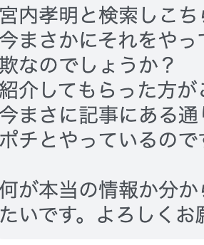 今旦那さんにDVされたとチャット欄で相談あり→逃げるための資金がない→宮内孝明がなんらかの方法で手元にあるお金を増やしてくれた→翌日に、同じやり方でお金増やせるキャンペーンの案内です。