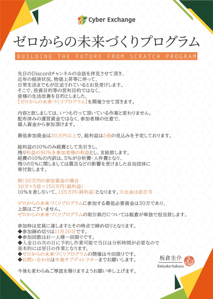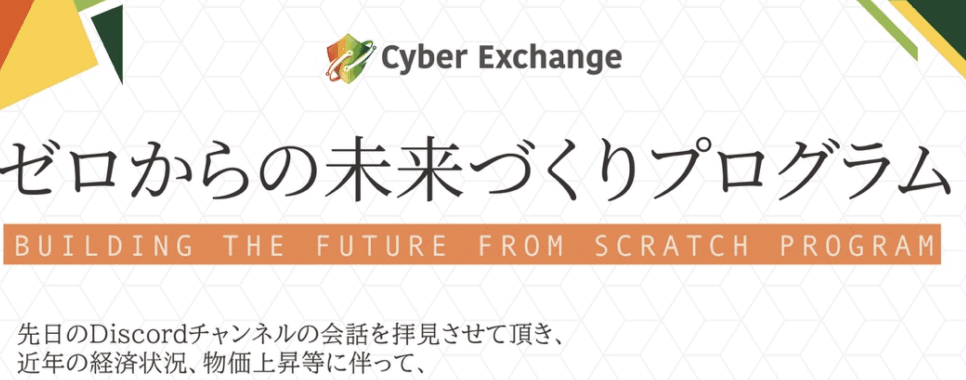 一年前から同じ手口で、SNSでバカを勧誘して振込させては逃げて、Cyber Exchange、ゼロからのミライづくりプログラムに名前変えて同じことしてる様子がありますねえ。