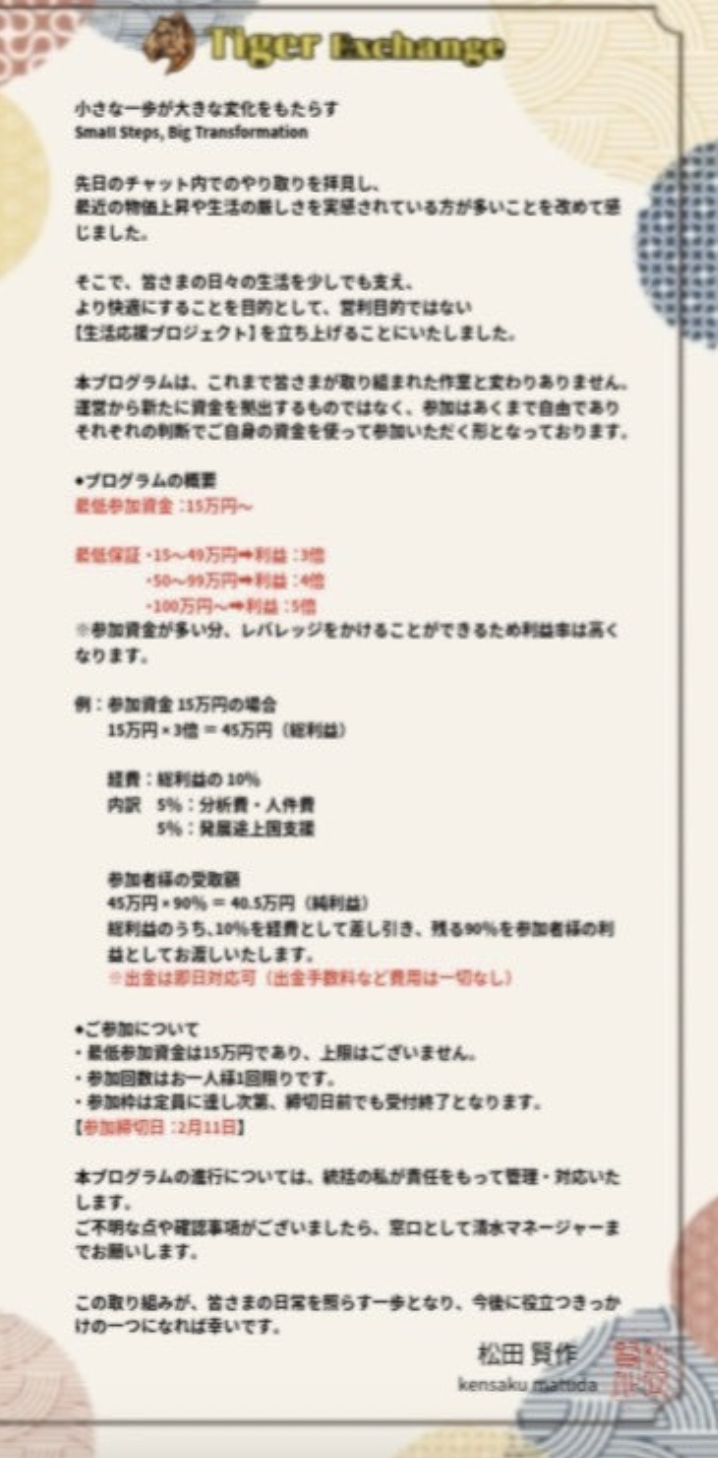 - そして必ず出てくる要求 → 参加費・処理費用・ミス補填・出金手数料などの名目で、あなたの口座から知らない相手へ振り込み
