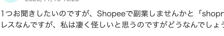 1つお聞きしたいのですが、Shopeeで副業しませんかと「shopnestgoo.xyz」アドレスなんですが、私は凄く怪しいと思うのですがどうなんでしょうか?
